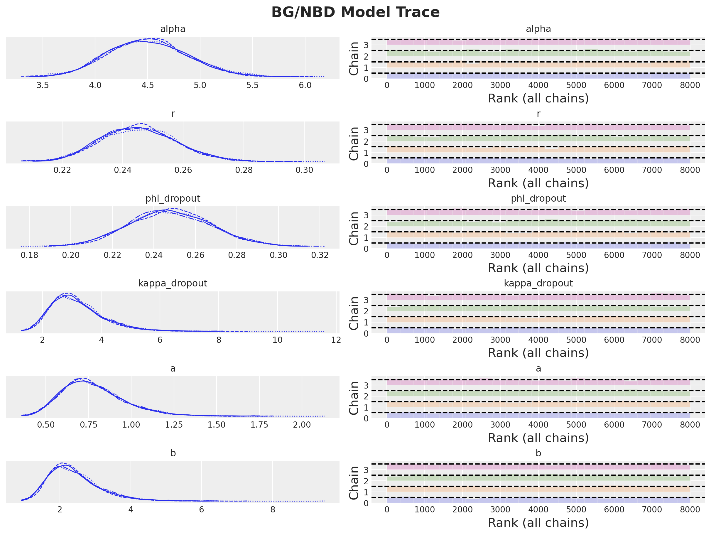 We can now fit the model. The default sampler in PyMC-Marketing is the No-U-Turn Sampler (NUTS). We use the default \(4\) chains and \(1000\) draws per chain.