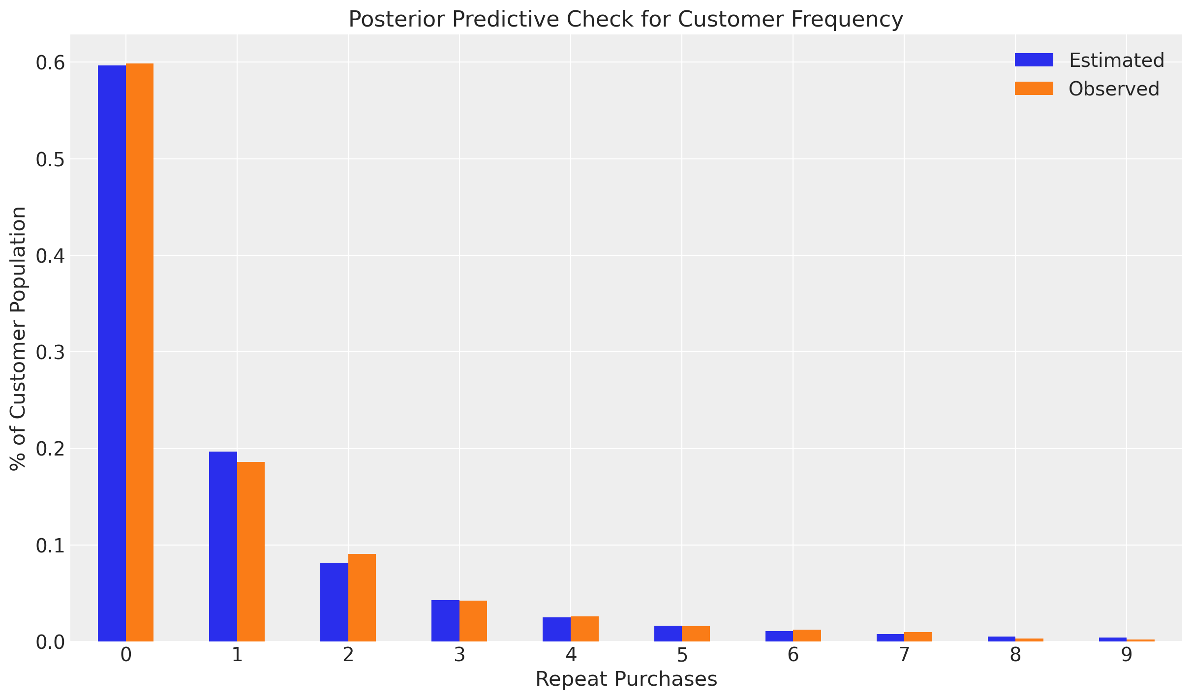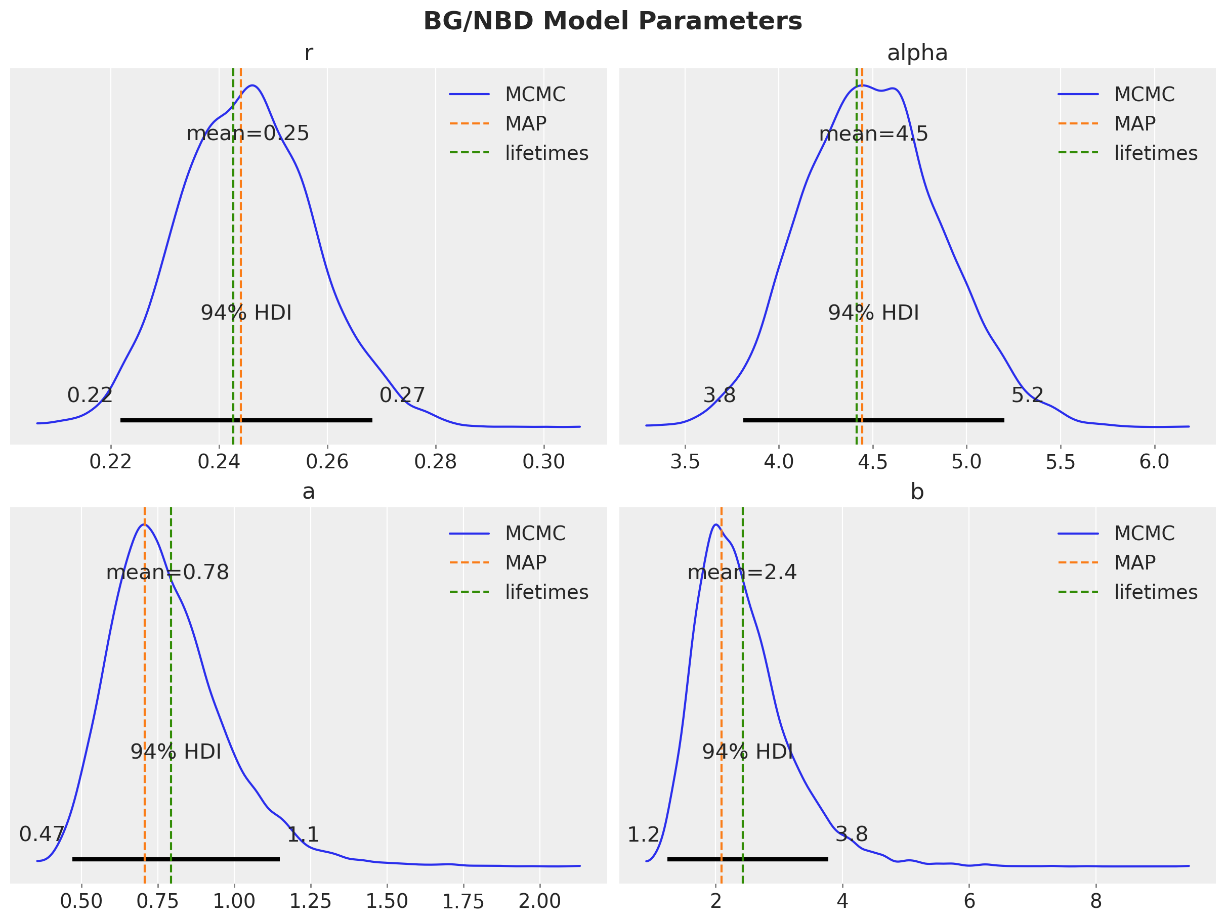 In this notebook we show how to fit a BG/NBD model in PyMC-Marketing. We compare the results with the lifetimes
