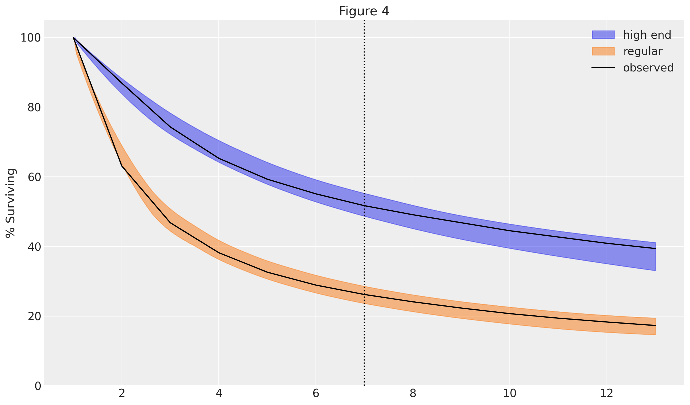The dataset contains the percentage of customers still enrolled in the service after each time period. There are two distinct groups of users: regular and high-end, believed to have different attrition rates. Each group had 1000 customers at the start.