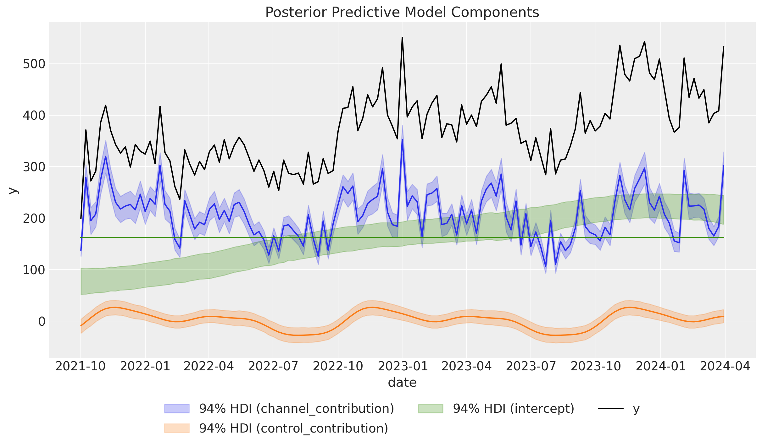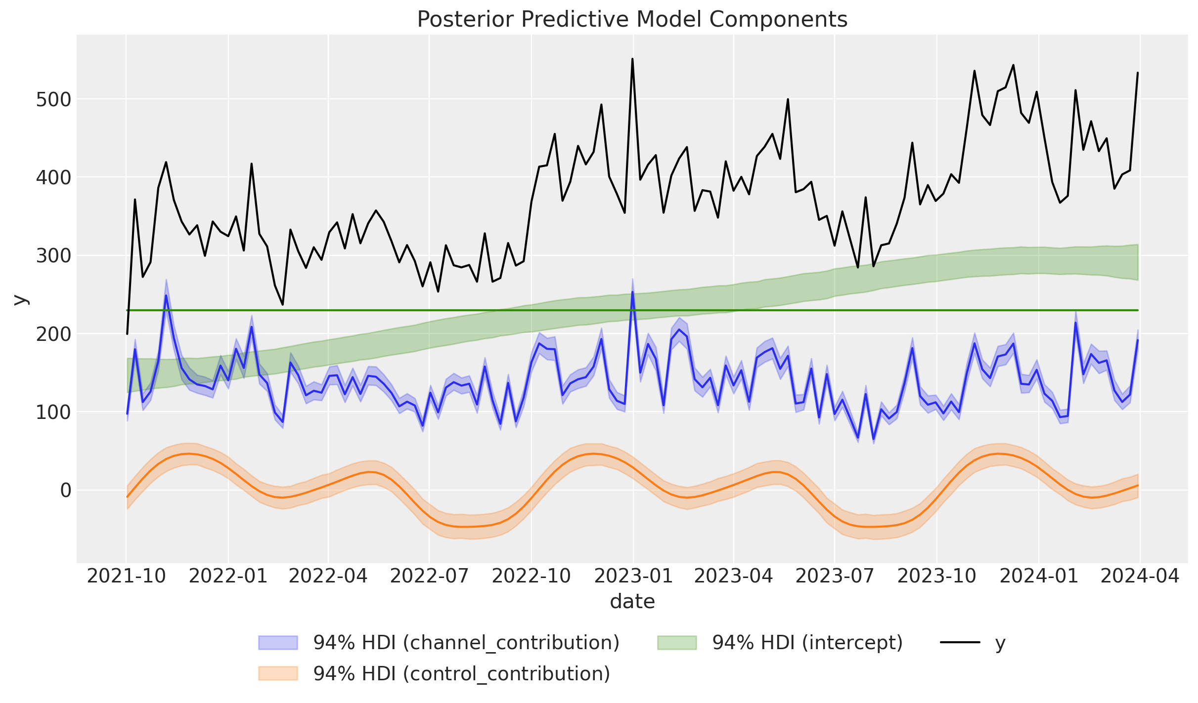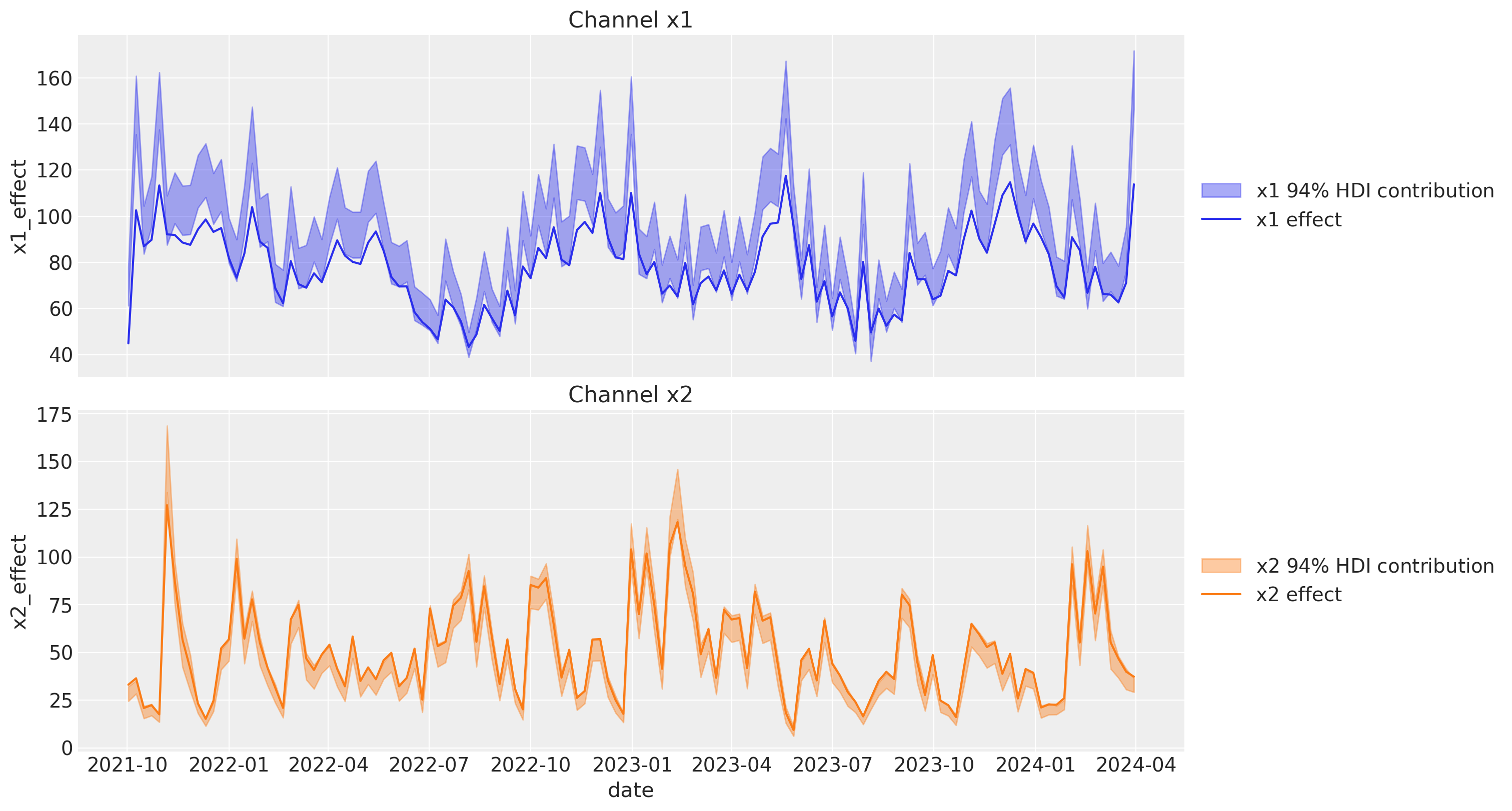 The contributions look much better and they are very close to the ones of the original blog post! Hence, these two approaches are very similar. However note that the PyMC-Marketing approach is more flexible as it allows to enrich the estimates with more test and different media spends to have a better understanding of the saturation effect.